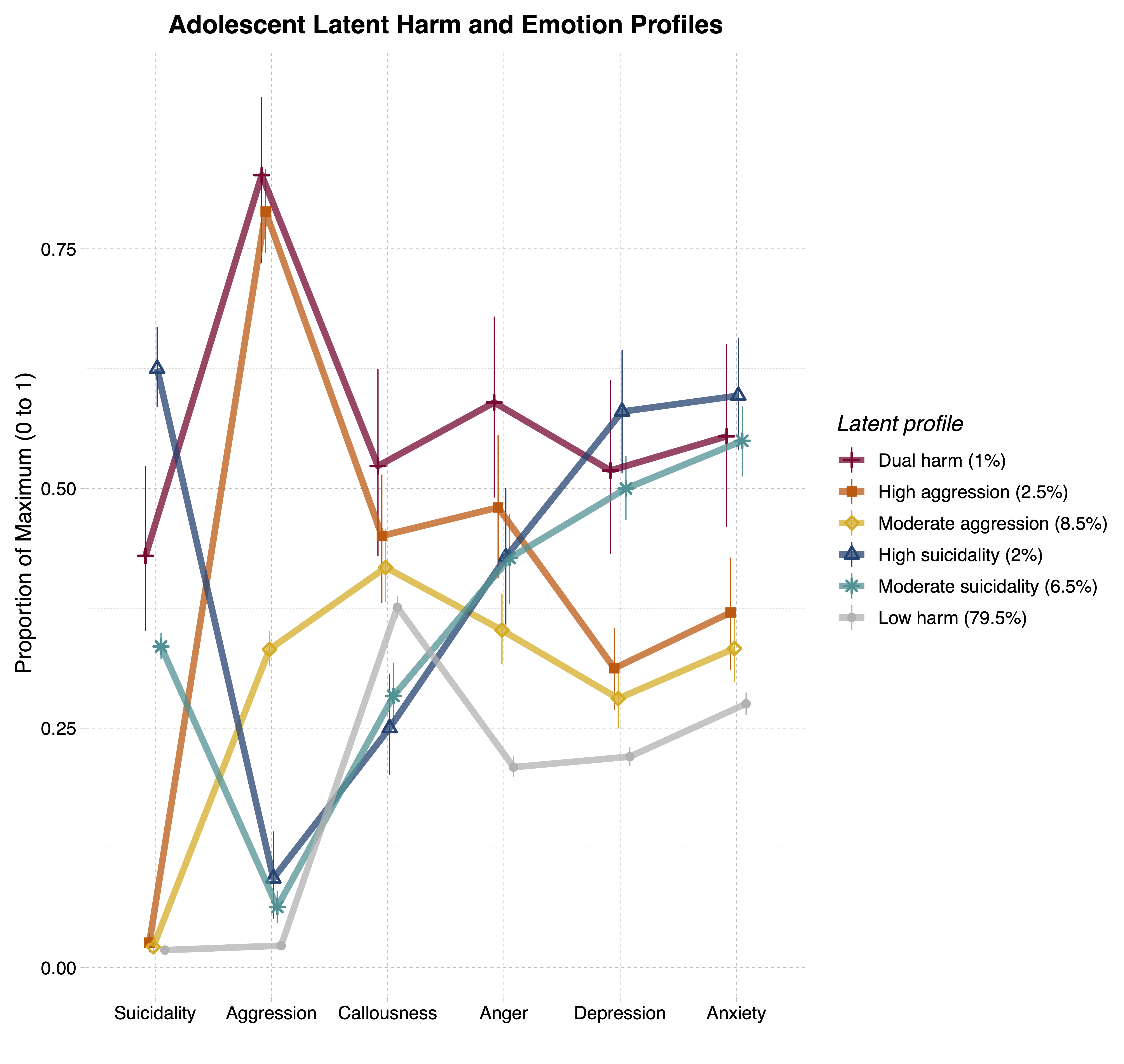 Most youth (~80%) showed little to no harm towards others or themselves. Of the youth showing harm, 95% of them appear to primarily harm either themselves OR others, not both. All youth showing harm had on average higher negative emotionality, but only those showing heightened aggression had higher callousness. Whether suicidality co-occurs with aggression seemed to depend on the severity of the youth’s negative emotionality.