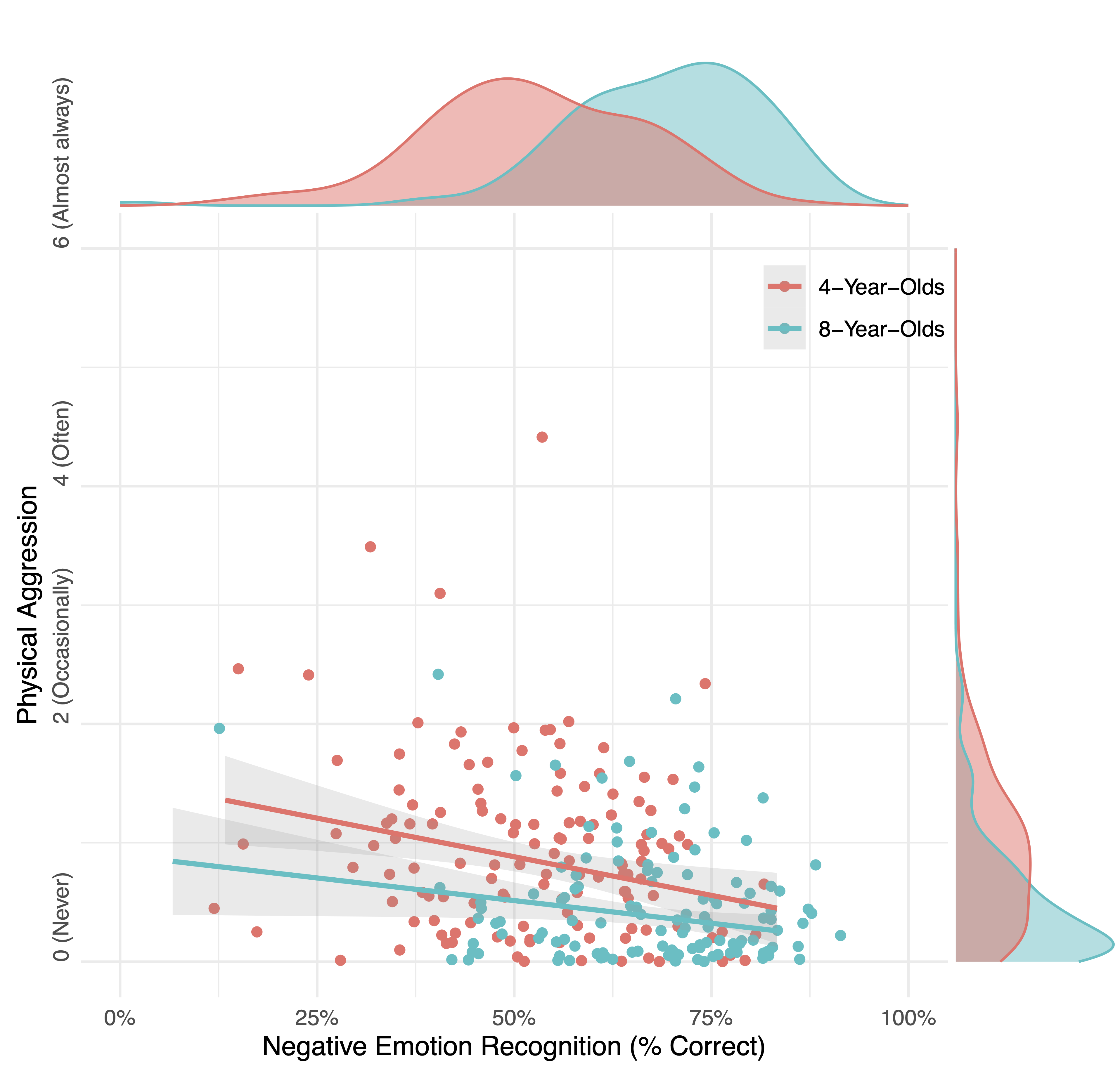 Figure. Negative emotion recognition’s relation to concurrent physical aggression in 4- and 8-year-olds. Jitter was added to points. Recognition scores represent what % of the 30 negative expressions children correctly identified. The density of score distributions are provided on the top (emotion recognition) and right side (aggression) of the graph by age.
