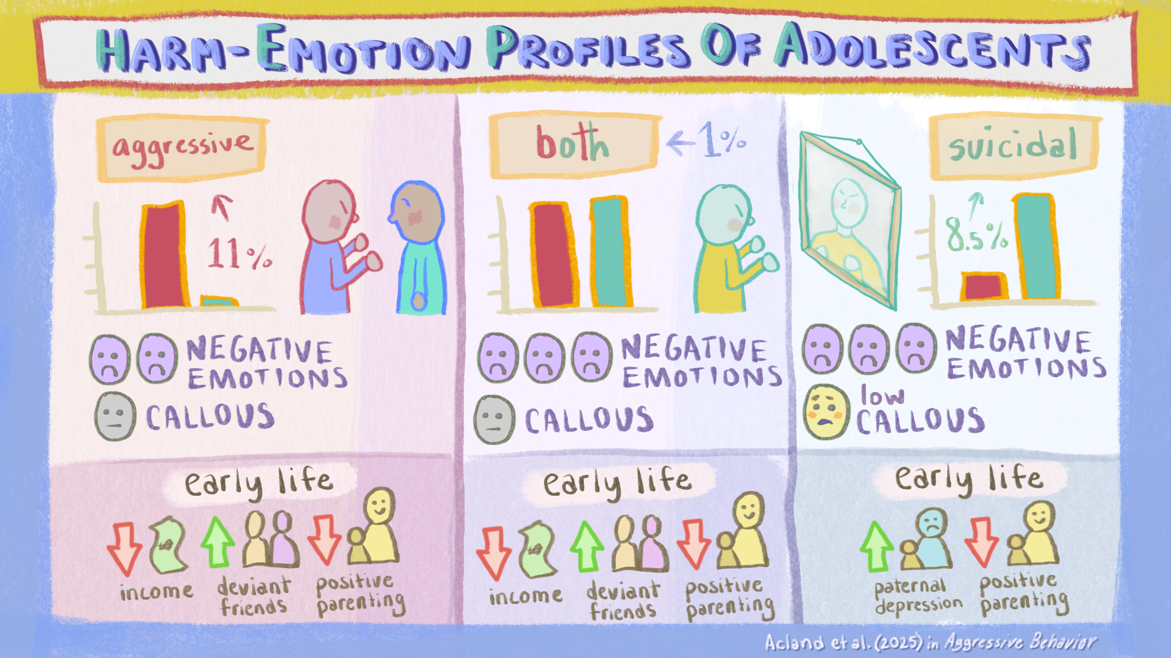 Acland, E.L., Pocuca, N., Chaput-Langlois, S., Hamaoui, J., Girard-Lapointe, J., & Côté, S.M., Castellanos-Ryan, N., Geoffroy, M.C. (2025). Aggression, suicidality, and emotion profiles in youth: Links to early life adversity. Aggressive Behavior. https://doi.org/10.1002/ab.70038 (Open access article).